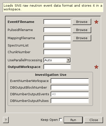 | OutputWorkspace | Output | IEventWorkspace | Mandatory | The name of the workspace that will be created, filled with the read-in data and stored in the [[Analysis Data Service]]. |