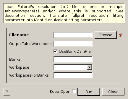 Load Fullprof resolution (.irf) file to TableWorkspace(s) and optionally into the instruments of matrix workspaces with one workspace per bank of the .irf file. Either or both of the Tableworkspace(s) and matrix workspace must be set.