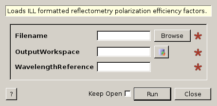 This algorithm loads reflectometry polarization efficiency data from ILL’s IDL-style text files. The output is a workspace with the efficiency factors calculated for each bin or point in the first spectrum of the WavelengthReference workspace. The output workspace is populated with five histograms carrying the following vertical axis labels: