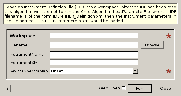 Loads an Instrument Definition File (IDF) into a workspace. After the IDF has been read this algorithm will attempt to run the Child Algorithm LoadParameterFile; where if IDF filename is of the form IDENTIFIER_Definition.xml then the instrument parameters in the file named IDENTIFIER_Parameters.xml would be loaded.