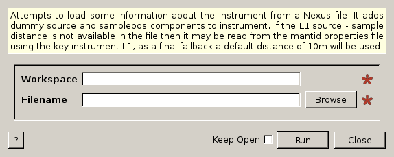 | Filename | Input | string | Mandatory | The name (including its full or relative path) of the Nexus file to attempt to load the instrument from. The file extension must either be .nxs or .NXS. Allowed extensions: [‘.nxs’] |