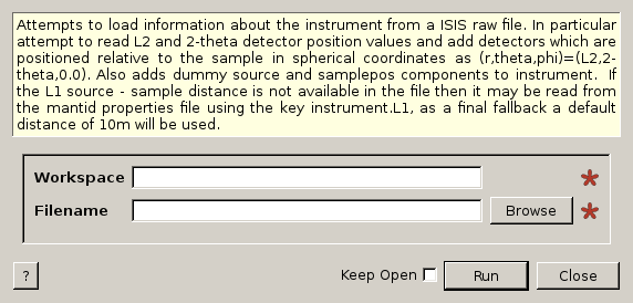 Attempts to load information about the instrument from a ISIS raw file. In particular attempt to read L2 and 2-theta detector position values and add detectors which are positioned relative to the sample in spherical coordinates as (r,theta,phi)=(L2,2-theta,0.0). Also adds dummy source and samplepos components to instrument. If the L1 source - sample distance is not available in the file then it may be read from the mantid properties file using the key instrument.L1, as a final fallback a default distance of 10m will be used.