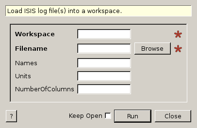 | Filename | Input | string | Mandatory | The filename (including its full or relative path) of a SNS text log file (not cvinfo), an ISIS log file, or an ISIS raw file. If a raw file is specified all log files associated with that raw file are loaded into the specified workspace. The file extension must either be .raw or .s when specifying a raw file. Allowed extensions: [‘.txt’, ‘.log’] |
