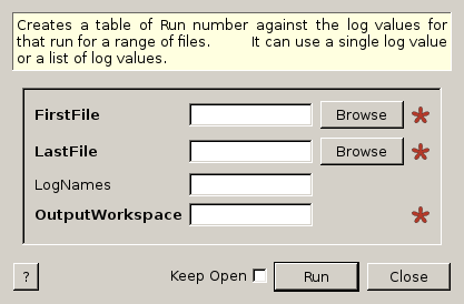 Creates a table of Run number against the log values for that run for a range of files. It can use a single log value or a list of log values.