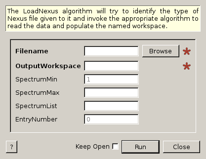 | Filename | Input | string | Mandatory | The name of the Nexus file to read, as a full or relative path. Allowed extensions: [‘.nxs’, ‘.nx5’, ‘.xml’, ‘.n*’] |