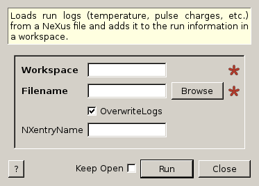 | Workspace | InOut | MatrixWorkspace | Mandatory | The name of the workspace that will be filled with the logs. |