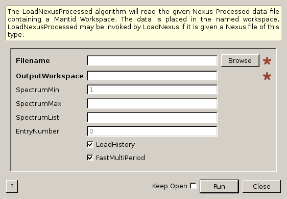 | FastMultiPeriod | Input | boolean | True | For multiperiod workspaces. Copy instrument, parameter and x-data rather than loading it directly for each workspace. Y, E and log information is always loaded. |