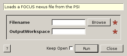 | Filename | Input | string | Mandatory | The name of the Nexus file to load. Allowed extensions: [‘.nxs’, ‘.hdf’] |