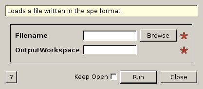 | Filename | Input | string | Mandatory | The name of the SPE file to load. Allowed extensions: [‘.spe’] |