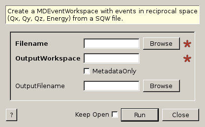 | OutputWorkspace | Output | MDEventWorkspace | Mandatory | Output IMDEventWorkspace reflecting SQW data read-in. |