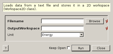 | OutputWorkspace | Output | MatrixWorkspace | Mandatory | The name of the workspace that will be created, filled with the read-in data and stored in the [[Analysis Data Service]]. |