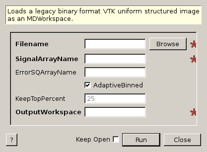 Loads a legacy binary format VTK uniform structured image as an MDWorkspace. Allows the user to provide the name of two scalar arrays expected to be located on the PointData. One array is loaded as the MDWorkspace signal data and is mandatory. The other array is optional and provides the error squared data. Both arrays are expected to be of the type vtkUnsignedShortArray.