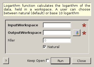 Logarithm function calculates the logarithm of the data, held in a workspace. A user can choose between natural (default) or base 10 logarithm