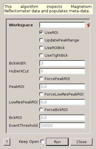 | PeakROI | Input | int list | 0,0 | Pixel range defining the reflectivity peak |