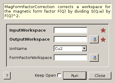 MagFormFactorCorrection corrects a workspace for the magnetic form factor F(Q) by dividing S(Q,w) by F(Q)^2.
