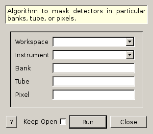 Algorithm to mask detectors in particular banks, tube, or pixels. It applies to the following instruments only: ARCS, CNCS, CORELLI, HYSPEC, NOMAD, POWGEN, SEQUOIA, SNAP, TOPAZ. For instruments with rectangular position sensitive detectors (POWGEN, SNAP, TOPAZ), the tube is corresponding to the x coordinate, and pixel to the y coordinate. For example, on SNAP Bank=”1”, Tube=”3” corresponds to ‘SNAP/East/Column1/bank1/bank1(x=3)’, and Bank=”1”, Tube=”3”, Pixel=”5” is ‘SNAP/East/Column1/bank1/bank1(x=3)/bank1(3,5)’.