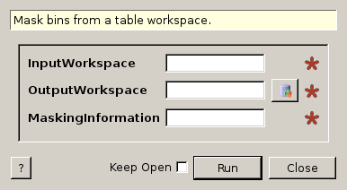 | InputWorkspace | Input | MatrixWorkspace | Mandatory | Input Workspace to mask bins. |