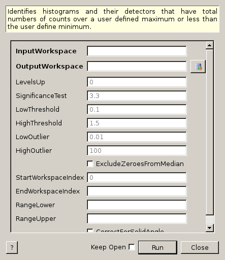 | RangeLower | Input | number | Optional | No bin with a boundary at an x value less than this will be included in the summation used to decide if a detector is ‘bad’ (default: the start of each histogram) |