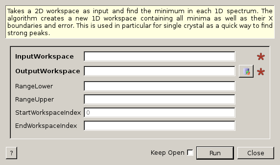 Takes a 2D workspace as input and find the minimum in each 1D spectrum. The algorithm creates a new 1D workspace containing all minima as well as their X boundaries and error. This is used in particular for single crystal as a quick way to find strong peaks.