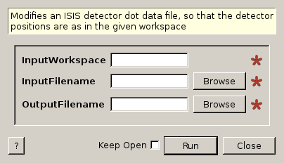 | InputWorkspace | Input | Workspace | Mandatory | Workspace with detectors in the positions to be put into the detector dot dat file |