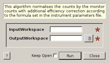 This algorithm normalises the counts by the monitor counts with additional efficiency correction according to the formula set in the instrument parameters file.