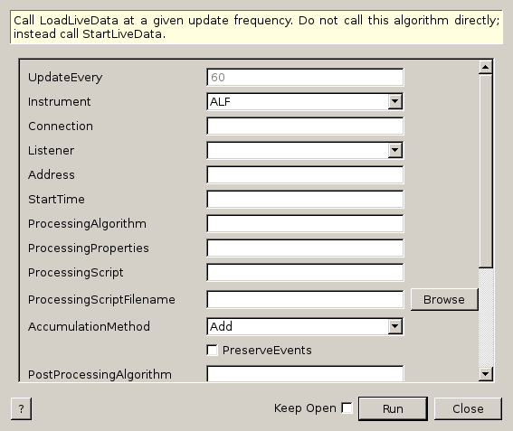 | AccumulationMethod | Input | string | Add | Method to use for accumulating each chunk of live data. - Add: the processed chunk will be summed to the previous outpu (default). - Replace: the processed chunk will replace the previous output. - Append: the spectra of the chunk will be appended to the output workspace, increasing its size. Allowed values: [‘Add’, ‘Replace’, ‘Append’] |