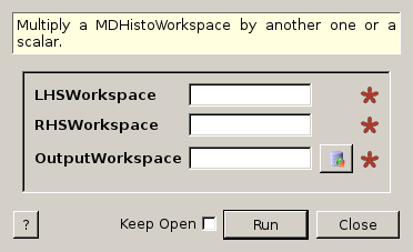 Multiply two MDHistoWorkspace‘s or a MDHistoWorkspace and a scalar.