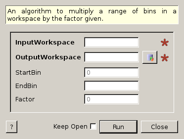 The algorithm multiplies the Y values in a range of bins in a workspace by the factor given.