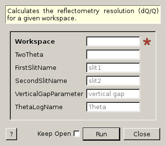 This algorithm takes a workspace and a value for two theta, and attempts to calculate the reflectometry resolution (dQ/Q) from them. If no value is provided for two theta then NRCalculateSlitResolution will attempt to fetch a value from the workspace’s log using the theta log name provided.