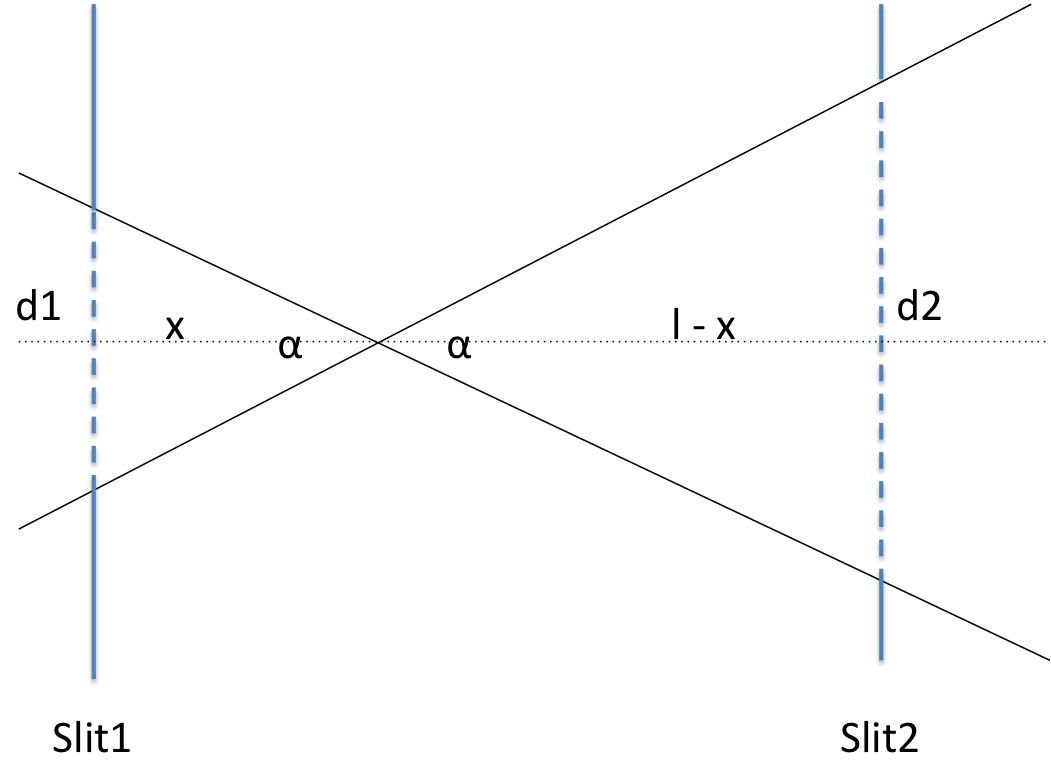 gives is the beam divergence in radians. Parameter d1 is the vertical distance of Slit1 opening, d2 is the same for Slit2. parameter l is the distance between the slits in the beam direction. See figure above for reference.