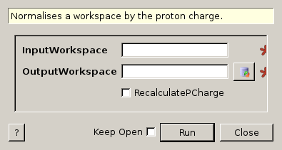 Normalises a workspace according to the good proton charge figure taken from the Input Workspace log data, which is stored in the workspace’s sample objects). Every data point (and its error) is divided by that number. The good proton charge value is added to the normalized workspace as the value of NormalizationFactor log.