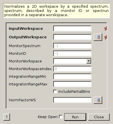 | MonitorWorkspace | Input | MatrixWorkspace | A workspace containing one or more spectra to normalize the InputWorkspace by. | |