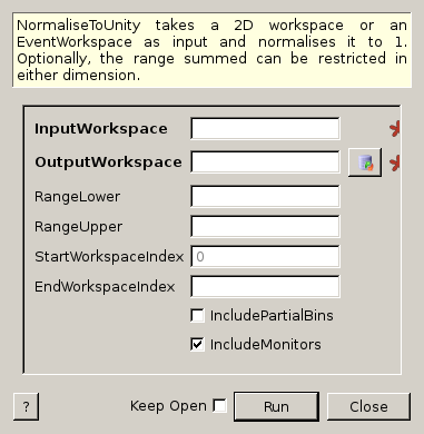 NormaliseToUnity takes a 2D workspace or an EventWorkspace as input and normalises it to 1. Optionally, the range summed can be restricted in either dimension.