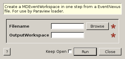 | OutputWorkspace | Output | Workspace | Mandatory | Name of the output MDEventWorkspace. |