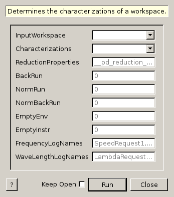 | Characterizations | Input | TableWorkspace | Table of characterization information | |