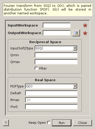 | InputWorkspace | Input | MatrixWorkspace | Mandatory | S(Q), S(Q)-1, or Q[S(Q)-1] |