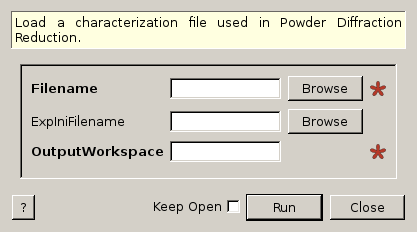 | OutputWorkspace | Output | TableWorkspace | Mandatory | Output for the information of characterizations and runs |