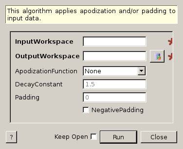 output=PaddingAndApodization(InputWorkspace=input,ApodizationFunction="Gaussian",DecayConstant=2.44,Padding=2,)