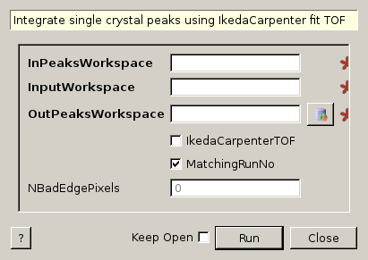 | OutPeaksWorkspace | Output | PeaksWorkspace | Mandatory | Name of the output peaks workspace with integrated intensities. |