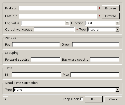 | DeadTimeCorrType | Input | string | None | Type of Dead Time Correction to apply. Allowed values: [‘None’, ‘FromRunData’, ‘FromSpecifiedFile’] |