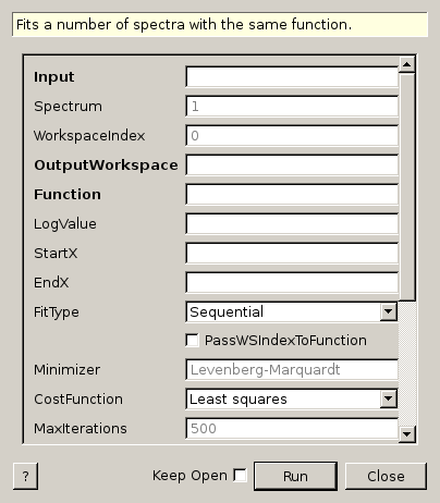 | PassWSIndexToFunction | Input | boolean | False | For each spectrum in Input pass its workspace index to all functions thathave attribute WorkspaceIndex. |