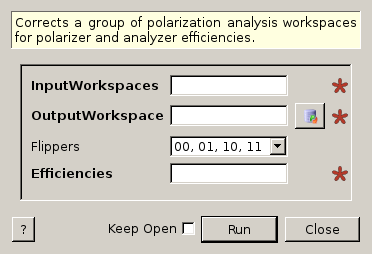 | Efficiencies | Input | MatrixWorkspace | Mandatory | A workspace containing the efficiency factors P1, P2, F1 and F2 as histograms |