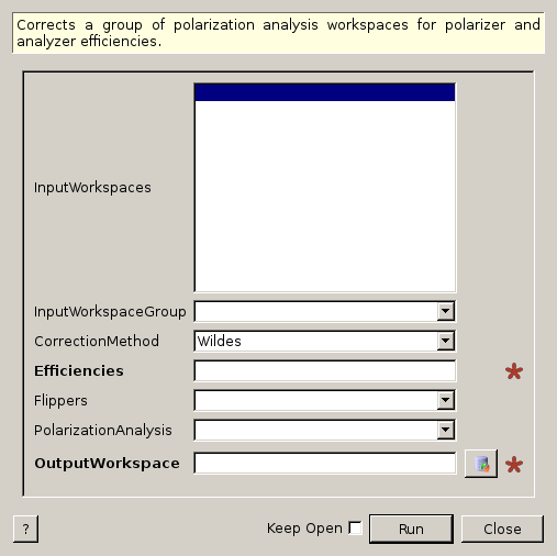 | OutputWorkspace | Output | WorkspaceGroup | Mandatory | A group of polarization efficiency corrected workspaces. |