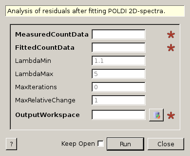 After fitting a model to POLDI 2D-data the residuals have to be analysed in order to determine whether the data are described by the model. Since this is very hard to see in the two dimensional residual data, the analysis involves a procedure that is very similar to the correlation method implemented in PoldiAutoCorrelation v5. The method is slightly different because the residual at a given point may be either positive or negative.