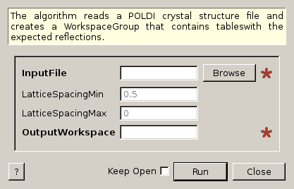 | InputFile | Input | string | Mandatory | A file with POLDI crystal data. Allowed values: [‘dat’] |