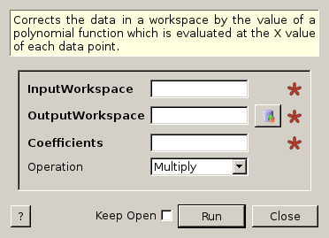 Corrects the data in a workspace by the value of a polynomial function which is evaluated at the X value of each data point.