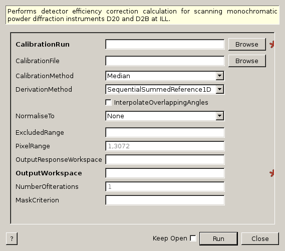 | OutputWorkspace | Output | MatrixWorkspace | Mandatory | Output workspace containing the calibration constants (inverse of efficiency) for each pixel. |