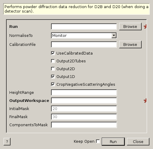 | Output2D | Input | boolean | False | Output a 2D workspace of height along tube against the real scattering angle. |