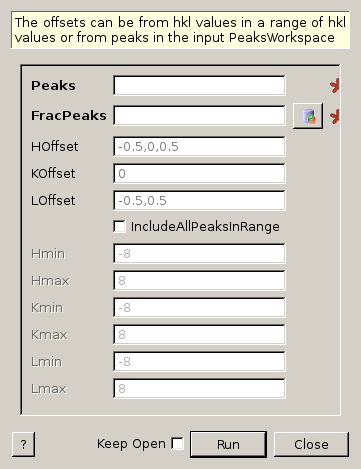 There are options to create Peaks offset from peaks from the input PeaksWorkspace, or to create peaks offset from h,k, and l values in a range. Zero offsets are allowed if some or all integer h,k, or l values are desired