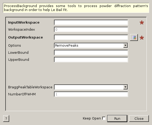 | InputWorkspace | Input | Workspace2D | Mandatory | Name of the output workspace containing the processed background. |